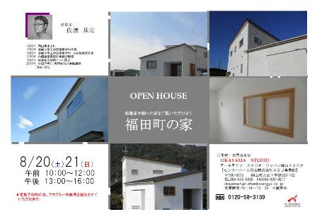 倉敷市福田町で建築中の、建築家佐渡基宏先生設計のO様邸が竣工間近となりました。 お施主様のご厚意により、8/20(土)・21(日)の二日間、完成見学会を開催いたします。
