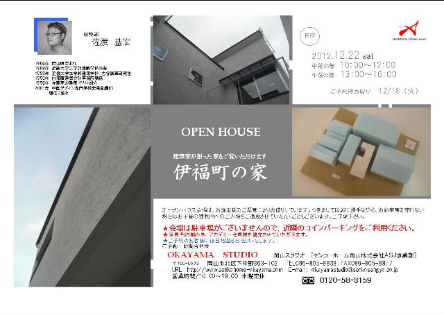 佐渡基宏先生(岡山)設計監理の【伊福町の家】の完成見学会をお施主様のご厚意により開催します。 日時:平成24年12月22日(土) 午前の部10:00~12:00 午後の部13:00~16:00 一日限りの予約制見学会となっております。 尚、見学会会場は駐車場がございません。 お近くのコインパーキングをご利用ください。 お申込締め切りは、12月18日(火)です。 お申込お待ちしてます。