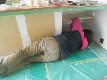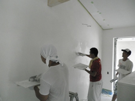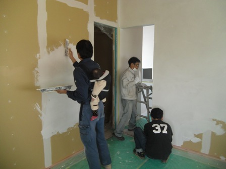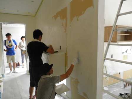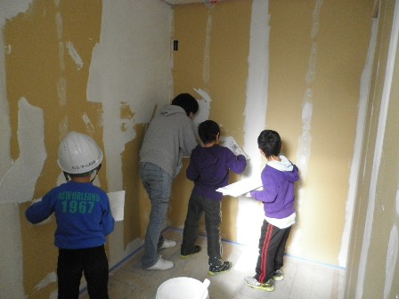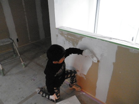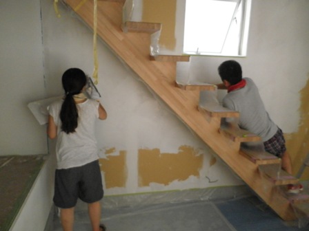 いとこと一緒に壁塗り。