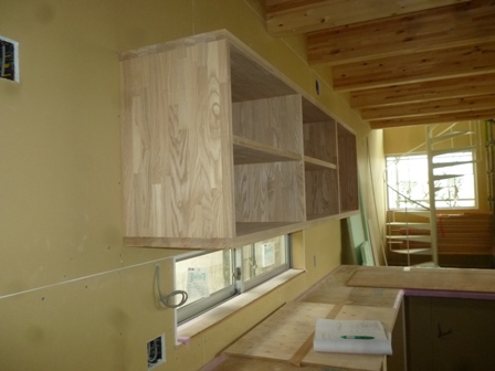 大工さんの内部作業は完了し、ソラマドキッチンにカップボードが取り付けされました。