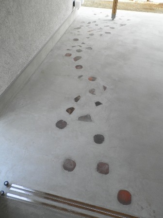 玄関アプローチに備前焼を埋めて土間を仕上げたり。