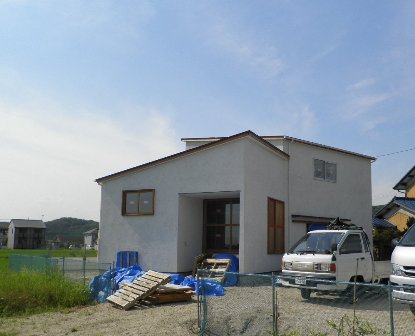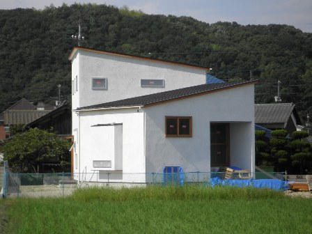 5月に上棟しました倉敷市福田町のO様邸。(建築家佐渡基宏先生設計) 足場がはずれました! こちらのO様邸はほぼぐるっと外観を見ることができます。 見る場所によって形が違って見えてとても面白いです。
