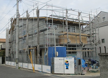 外部は外壁左官塗り仕上げの下塗りを施工中です。