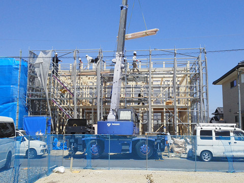 上棟日和の中、大工さんの連係プレーで順調に作業は進み、